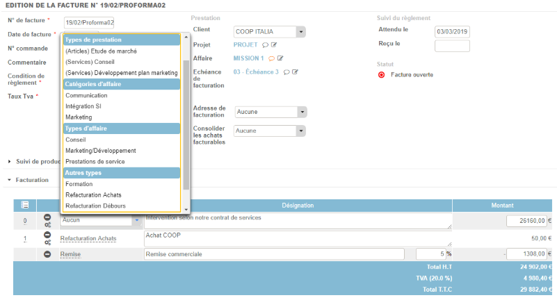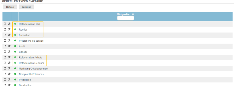 • complétée par les autres types non-configurables : Formation (si module actif), Refacturation Achats, Refacturation Débours, Refacturation Frais, Remise