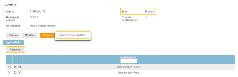 • complétée par la liste des types d’affaire, le type d'affaire étant le pivot d'intégration comptable par défaut (provenant de la configuration),