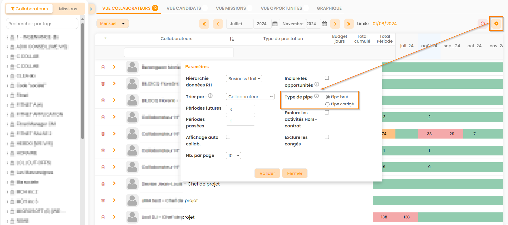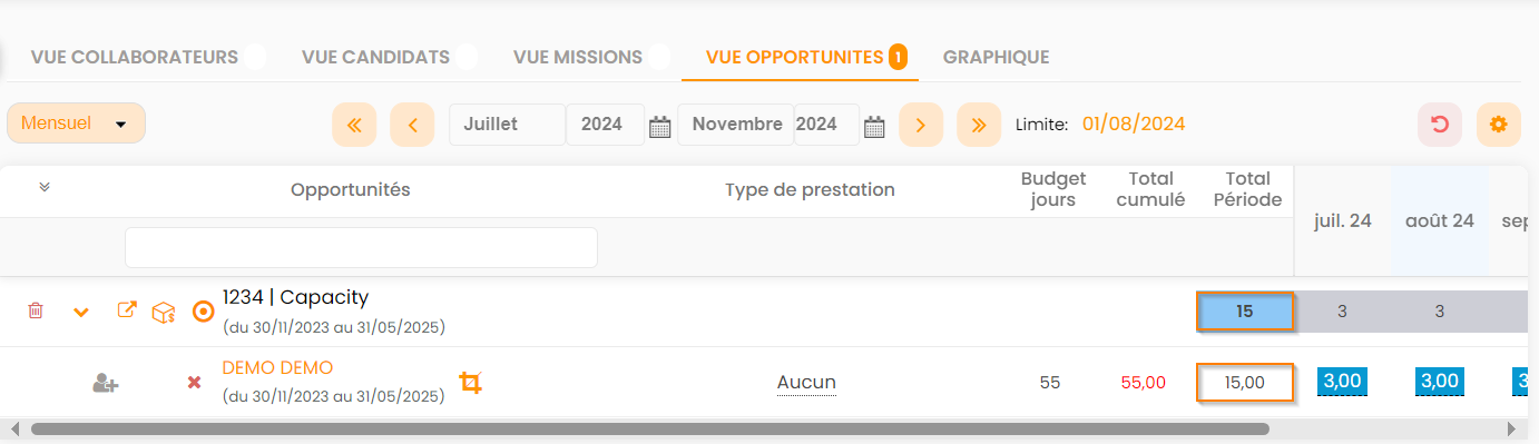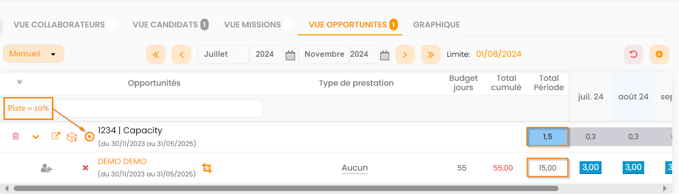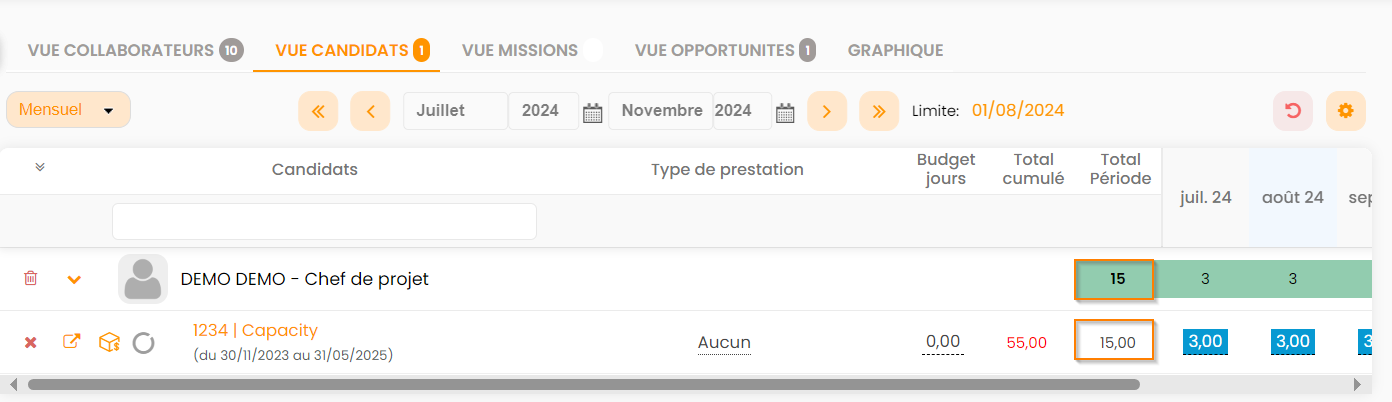 Les mécaniques d'utilisation du capacity planning sur les vues Candidats & Opportunité sont similaires à celles des vues Collaborateurs & Affaires/Missions.