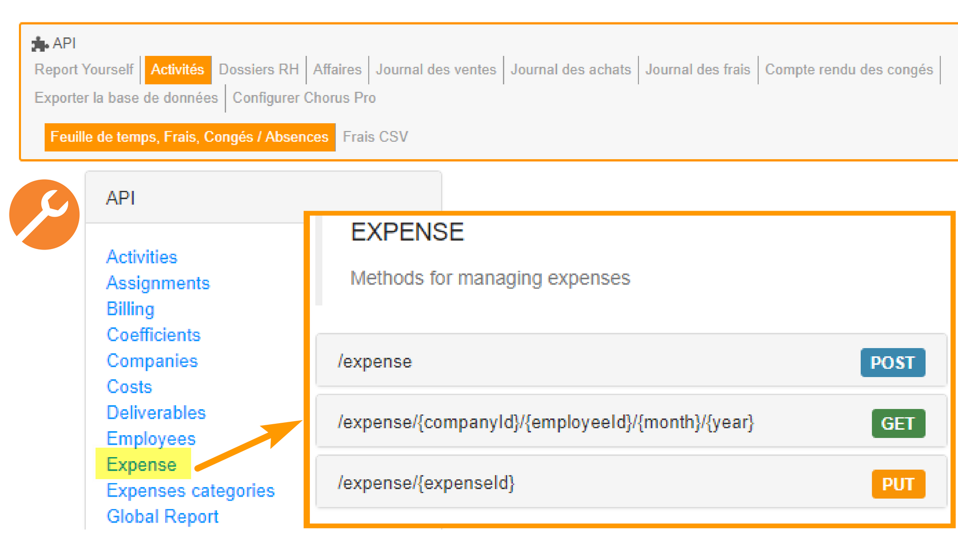 Pour y accéder, rendez-vous dans la Configuration de votre environnement > API > Activités > Feuille de temps, Frais, Congés/Absences, et cliquez sur "Expense".