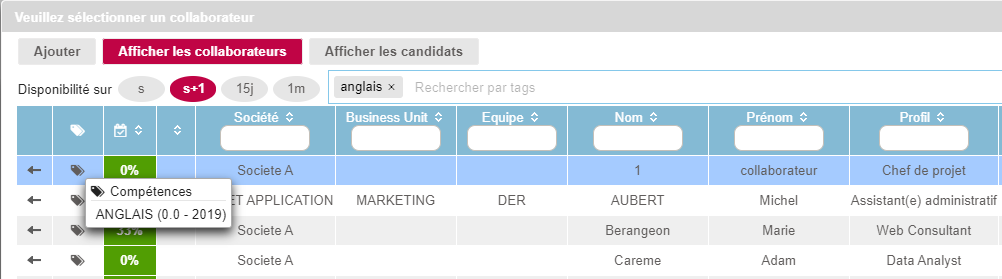 Dans la nouvelle zone de recherche renseignez un ou plusieurs tags - par exemple "développeur" "anglais" "senior" - et le système filtre automatiquement la liste des collaborateurs pour vous proposer ceux qui correspondent.