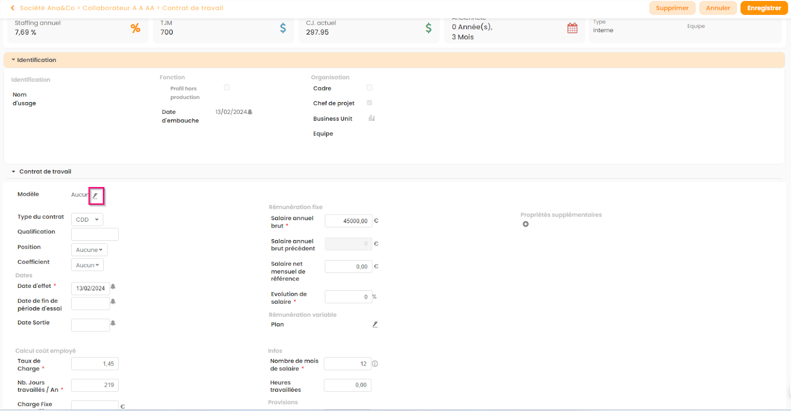 Une fois le modèle créé il est possible de l’utiliser lors de la création ou la modification d’un contrat de travail (voir capture d’écran ci-dessous).