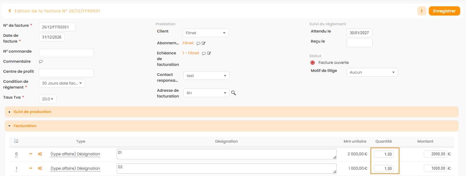 - Modification sur une proposition de facture : la quantité peut être ajustée sur chaque proposition de facture.