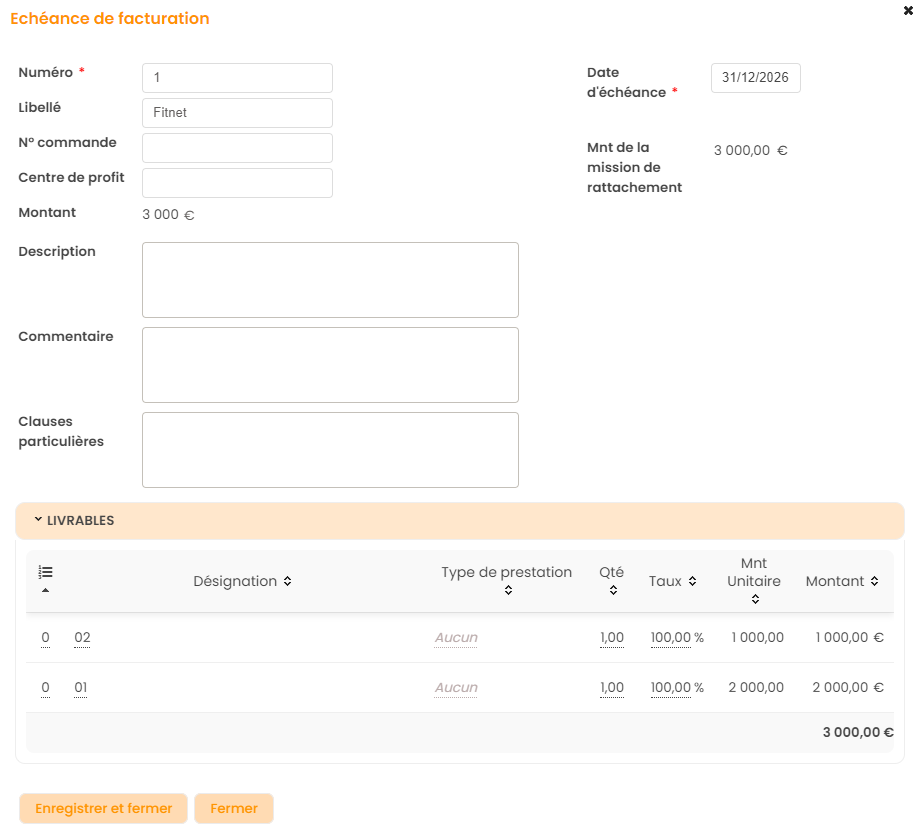 A noter : si on modifie une échéance dont la proposition de facture a déjà été enregistrée, une nouvelle proposition de facture sera générée automatiquement pour la différence