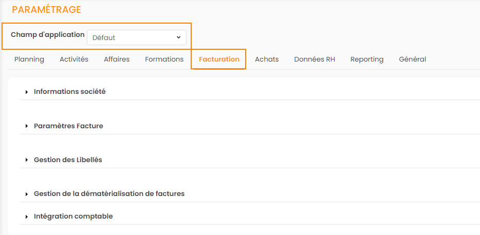 Pour modifier le paramètrage du module Facturation, aller dans le paramétrage > onglet Facturation.