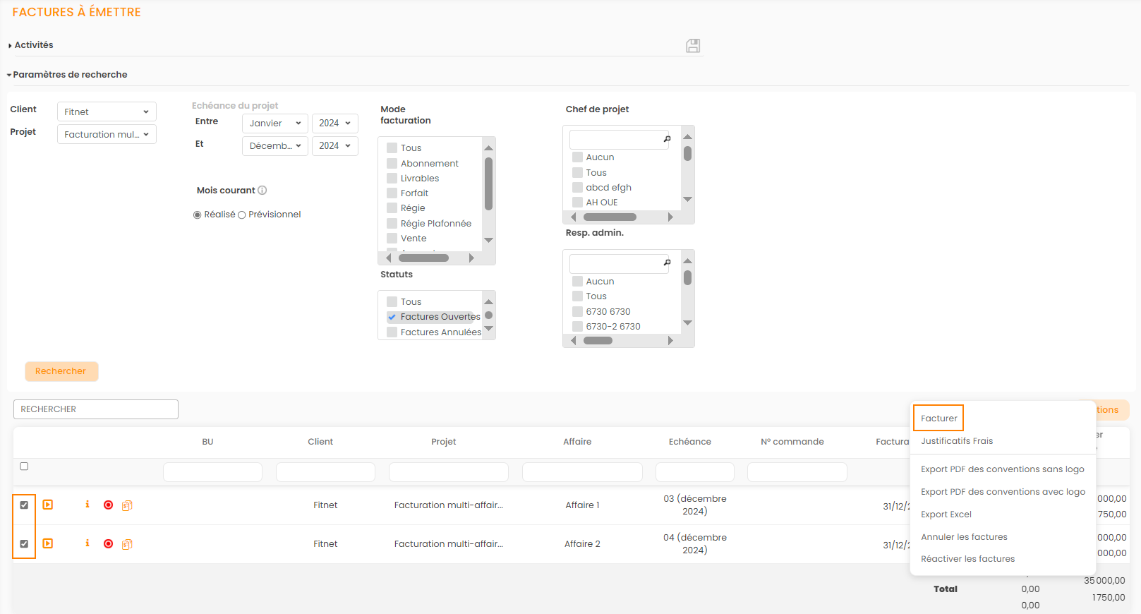 Il est donc important de préciser que si vous facturez en masse tout votre mois, toutes vos échéances sur un projet qui remplit les conditions de Facture Multi-Affaires vont se consolider en un et unique objet facture Fitnet.