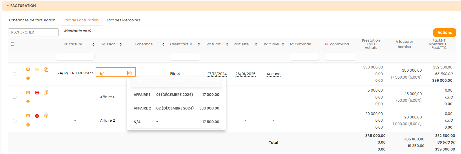 Niveau Projet, on retrouve ces informations génériques, en compilé. Il faut cliquer sur le cube ou le dollar pour faire apparaître les affaires ou les échéances rattachées à cette facture.