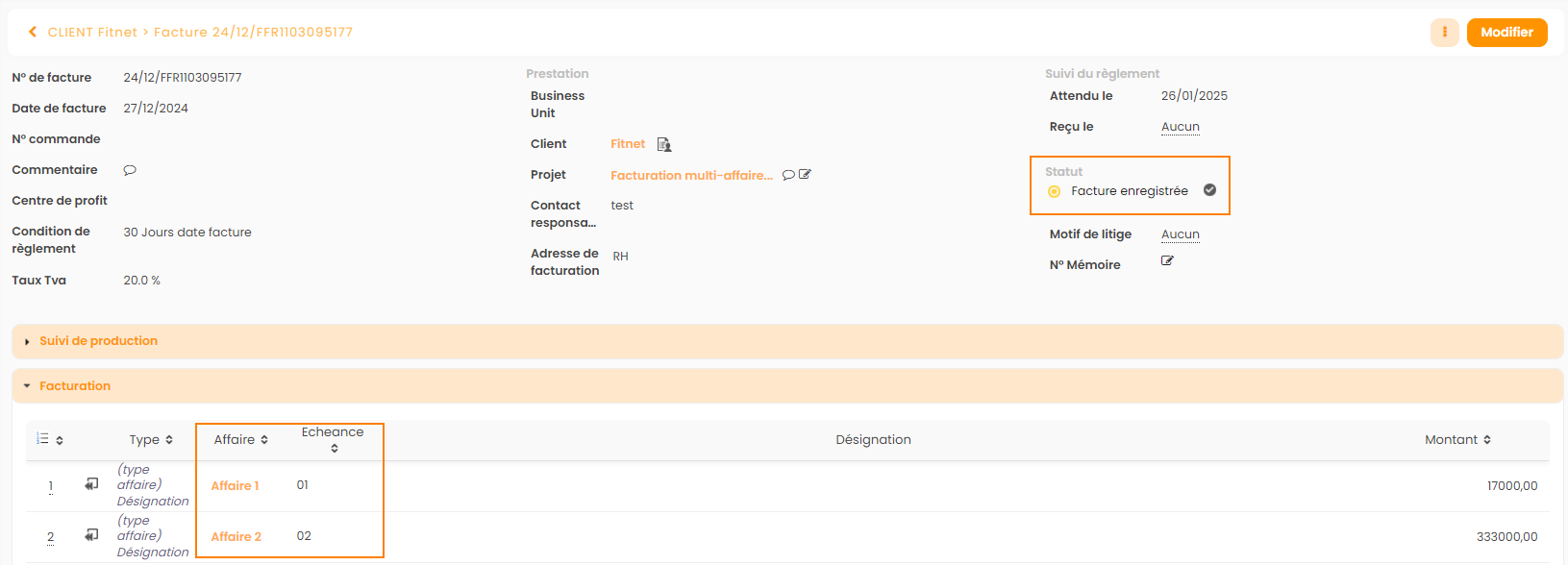 A l'enregistrement de la facture, on vous emmène directement à l'objet facture de Fitnet. Cette facture convertit donc plusieurs propositions de factures en une seule facture. On a également deux colonnes qui ont été ajoutées, pour savoir à quelle affaire et à quelle échéance se rapporte chaque ligne.