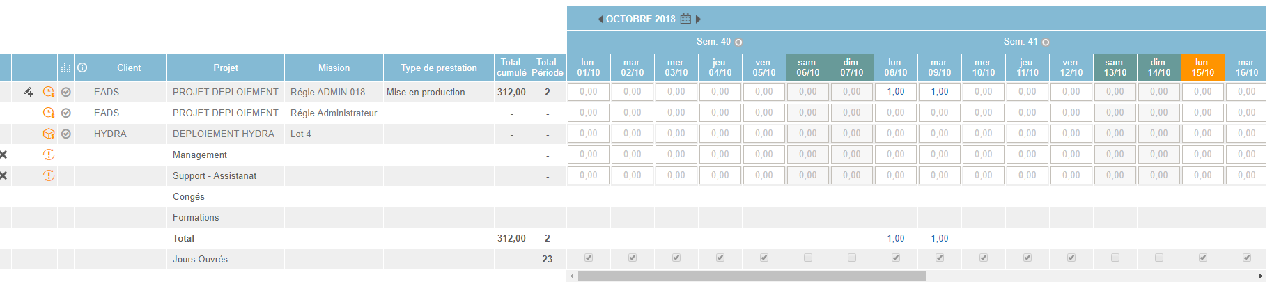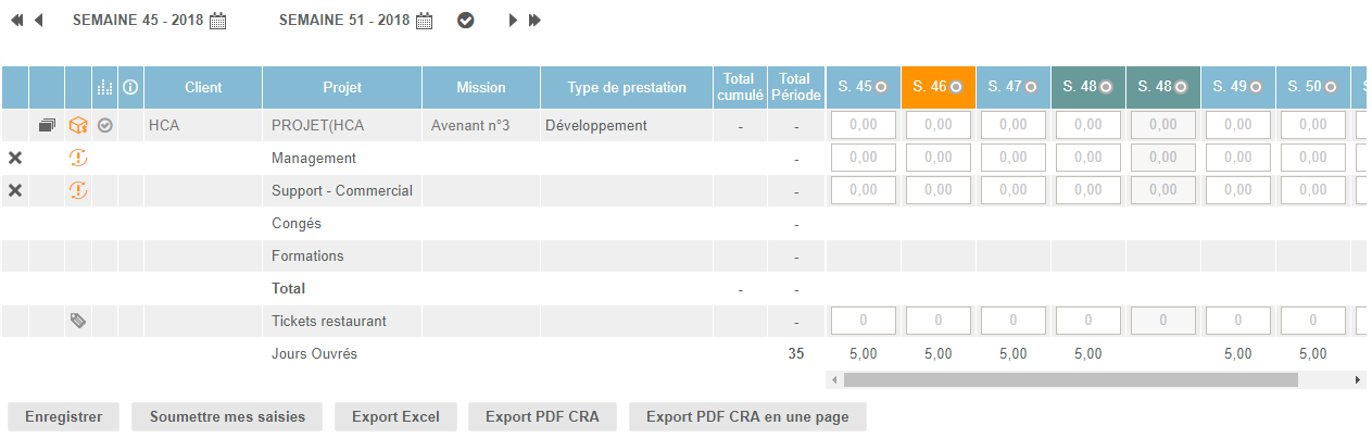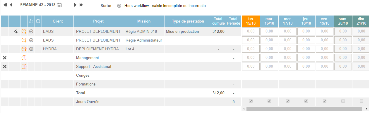 - Hebdomadaire (saisie de jours ou heures dans des semaines)