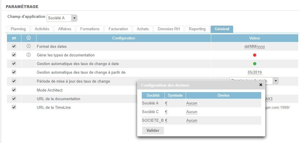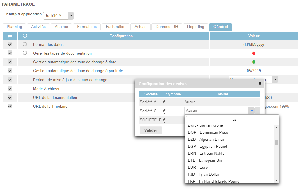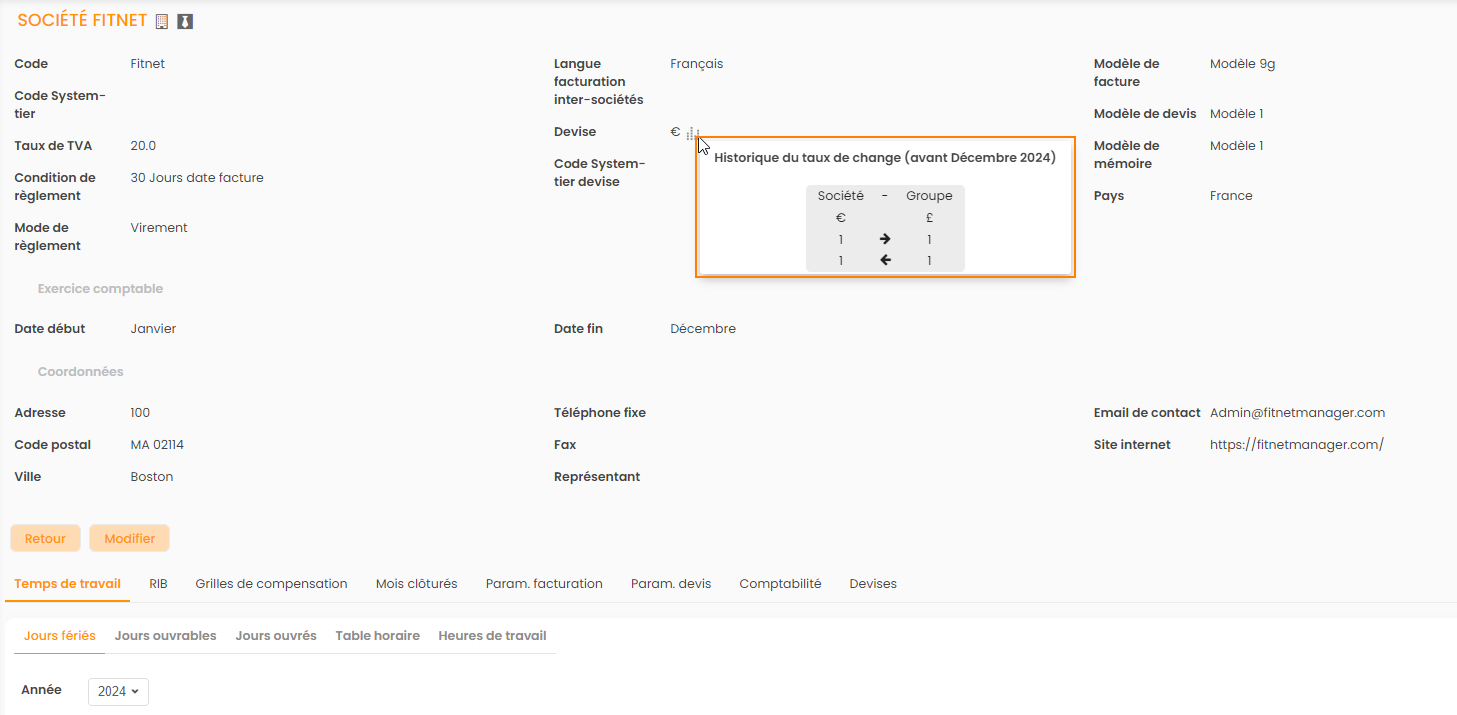 Par défaut dans Fitnet Manager, on gère une devise par société. Néanmoins, il est possible qu'au sein de différentes sociétés, vous ayez des devises différentes. C'est possible, et vous pourrez configurer une conversion par rapport à la devise du groupe, depuis la fiche Société. Celle-ci est disponible depuis Configuration>Société>Editer Société. Cela permet de calculer des tarifs dans la devise correcte du groupe, et d'avoir des reportings cohérents.