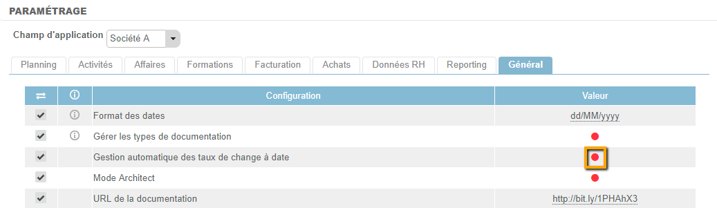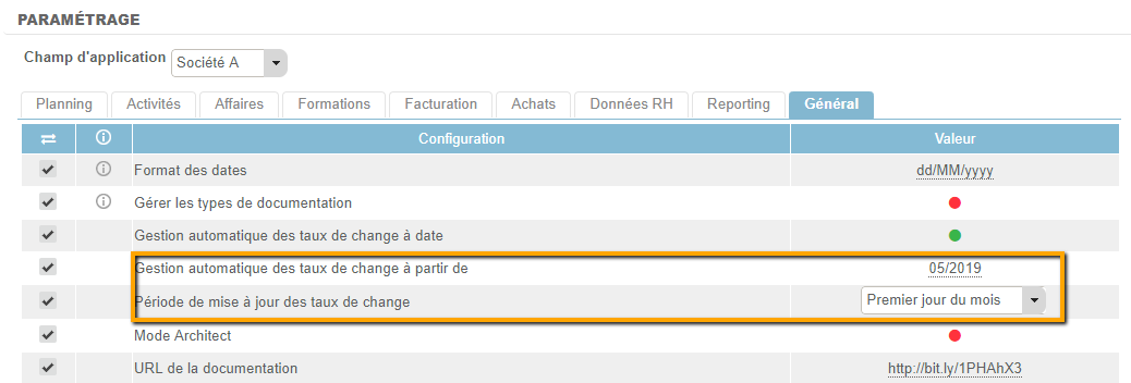 Ce paramètre pour les gérer par mois est activable depuis Paramétrage>Société>Gestion automatique des taux de change à date après avoir choisi la bonne société dans le champ d'application. Ce paramètre n'est pas global à toutes vos sociétés dans Fitnet Manager, il est nécessaire de l'activer pour chaque société. Si vous ne l'activez que sur une des sociétés, les autres continueront avec la gestion basique.