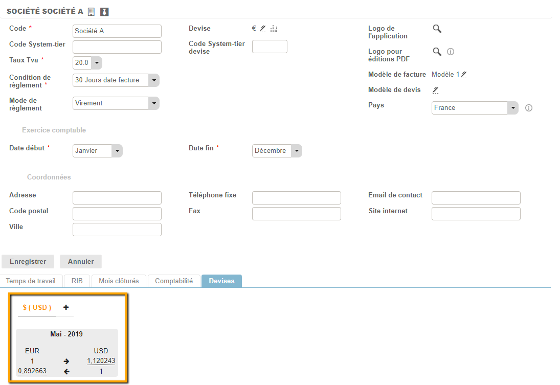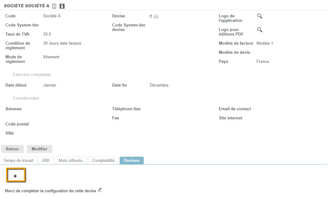 Un onglet devises a été créée en bas de la fiche société. De base, il n'y a pas de configuration si on active ce paramètre en milieu de mois, et aucune conversion puisqu'on ne sait pas vers quelle devise effectuer cette conversion. Il faut donc ajouter une autre devise, pour la définir.