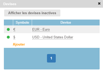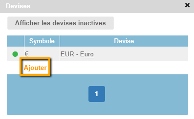 Dans la pop-up qui s'ouvre, vous pouvez choisir une autre devise si elle est déjà existant, ou si vous voulez avoir celle d'une de vos autres sociétés par exemple. Si ce n'est pas le cas, il vous faut ajouter une nouvelle devise. Comme pour les collaborateurs ou les clients, il est impossible de supprimer une devise ajoutée. Il faudra simplement la désactiver si vous ne l'utilisez pas ou plus.