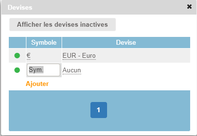 Quant à la devise, c'est une liste déroulante de toutes les devises officielles mondiales. Vous pouvez donc associer votre symbole à la devise concrète, avec son trigramme officiel.