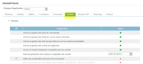 Pour modifier le paramétrage du module Achats, aller dans le paramétrage > onglet Achats.