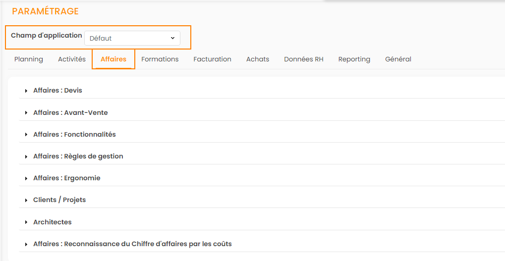 Pour modifier le paramétrage du module Affaires, aller dans le paramétrage > onglet Affaires.