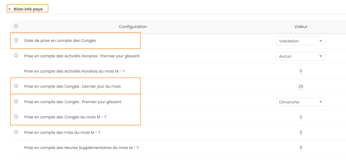 La valeur renseignée indique le mois des congés à récupérer par rapport au mois d’analyse M sélectionné dans le Bilan Info Paye. A noter : Uniquement les demandes des congés validées remontent dans le Bilan info paye. Plus d'informations ici.