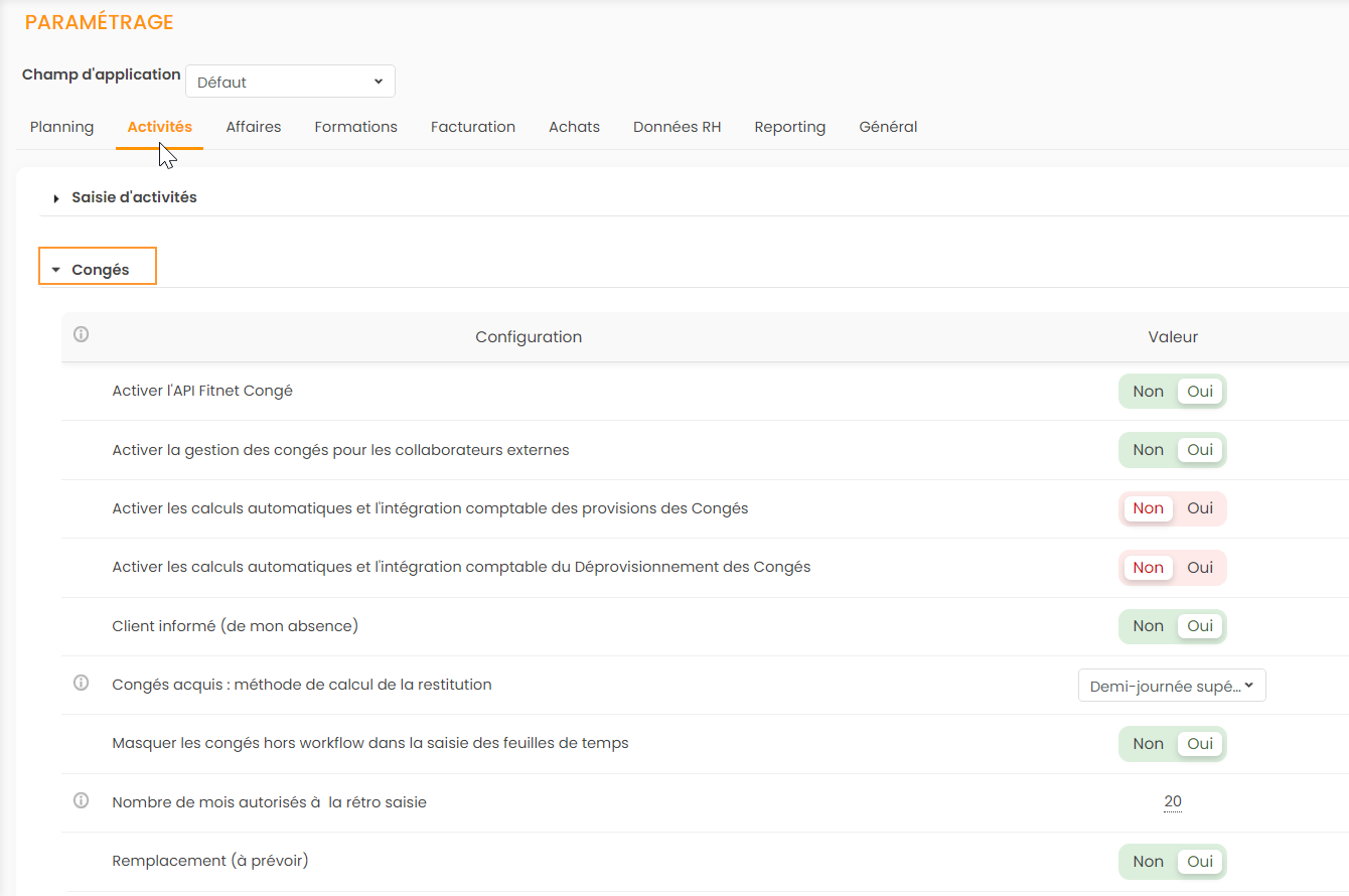 Pour modifier le paramétrage du module Congés, aller dans le paramétrage > onglet Activités >  Congés.