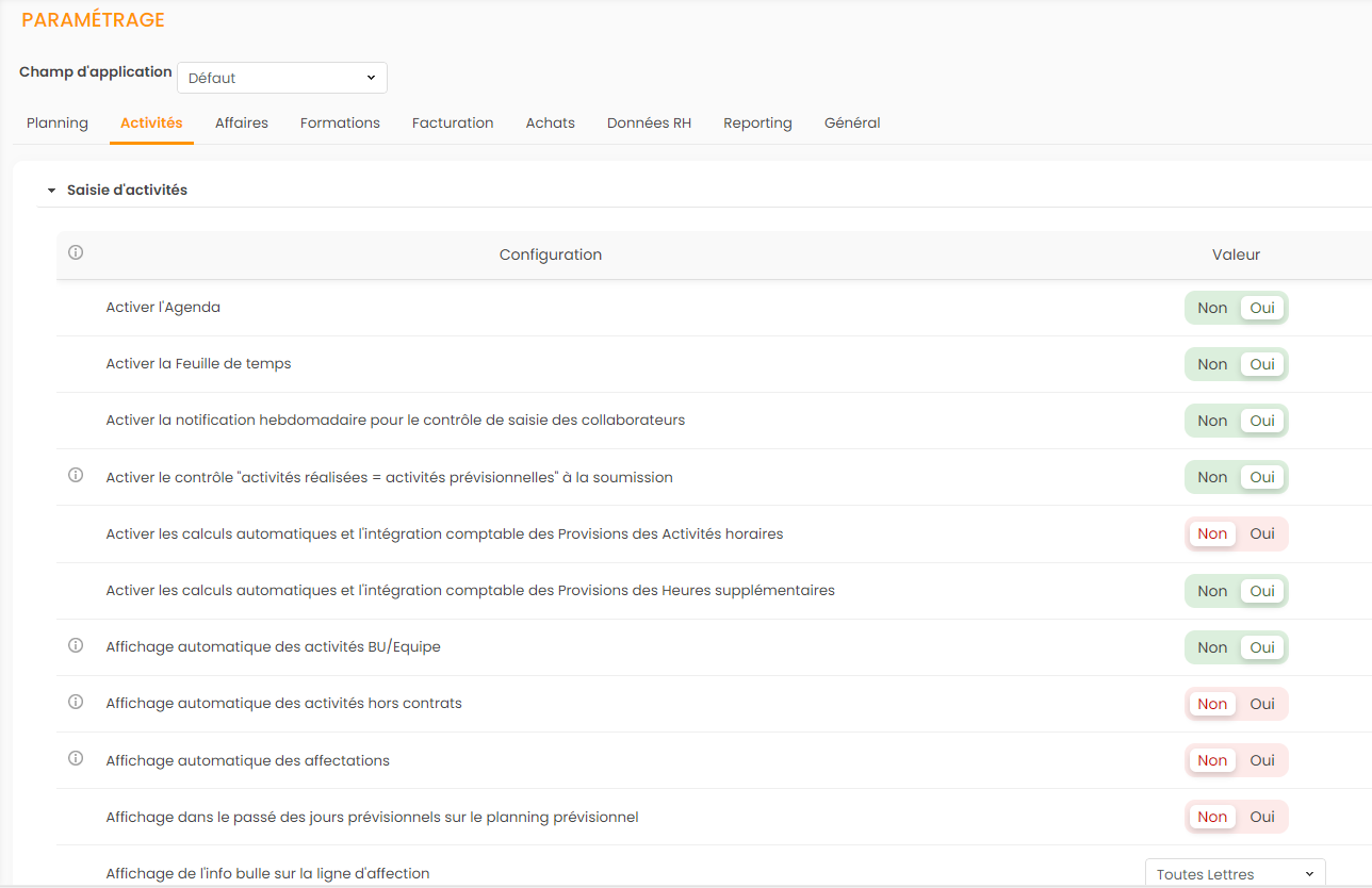 Pour modifier le paramétrage du module Feuilles de temps, aller dans le Paramétrage > onglet Activités > Saisie d'activités.