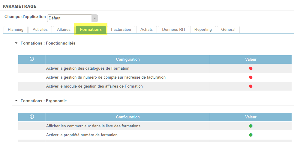Pour modifier le paramétrage du module Formation, aller dans le paramétrage > onglet Formation.
