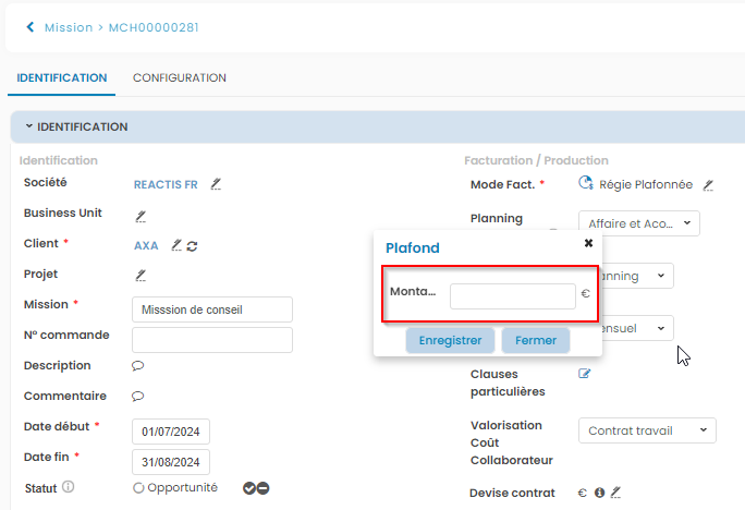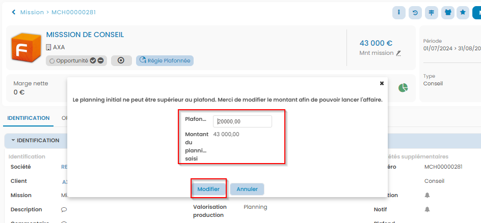 - Si jamais on rentre un planning initial qui correspond à un montant supérieur à cette valeur, alors le système bloquera le lancement de l'affaire, et nous forcera à modifier le plafond