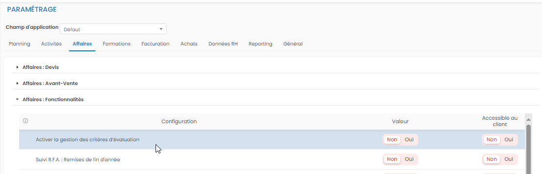 Pour activer la gestion des évaluations, il faut se rendre dans Paramétrage > Affaires > Affaires : Fonctionnalités et activer le point Activer la gestion des critères d'évaluation.