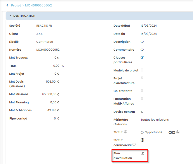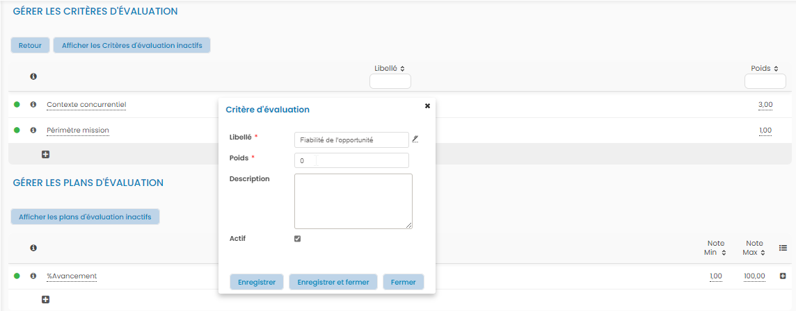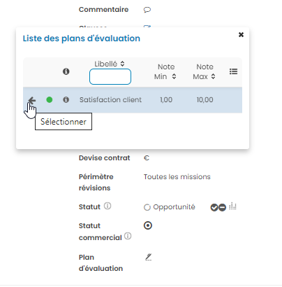 Suite à l'activation du point de paramétrage ci-dessus, il est possible de créer des plans d’évaluation sur les opportunités.