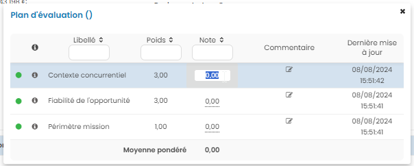 La moyenne pondérée du plan d’évaluation est alors calculée et une icône colorée s’affiche en fonction de la note obtenue (plus la note est bonne plus le graphique tend vers le vert). Cette icône apparaît également dans le tableau principal de gestion des opportunités, ce qui permet de visualiser rapidement l’évaluation des opportunités.