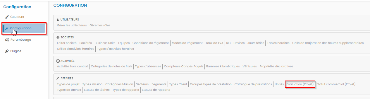 Avec ce point de paramétrage, le choix "Évaluation" apparaît dans le module Configuration-> Affaires.