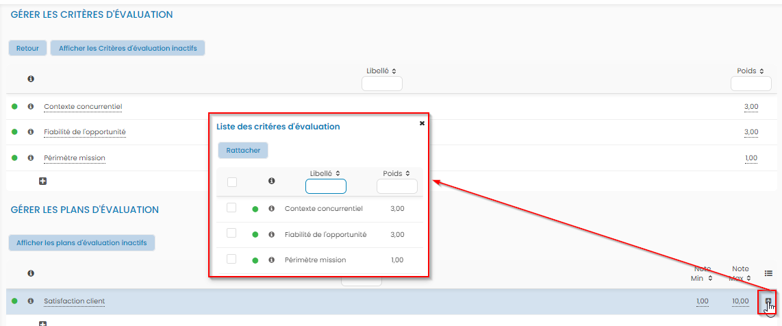 Enfin, vous affectez des critères sur le plan d’évaluation, en cliquant sur l’icône de la dernière colonne des lignes du plan d’évaluation.