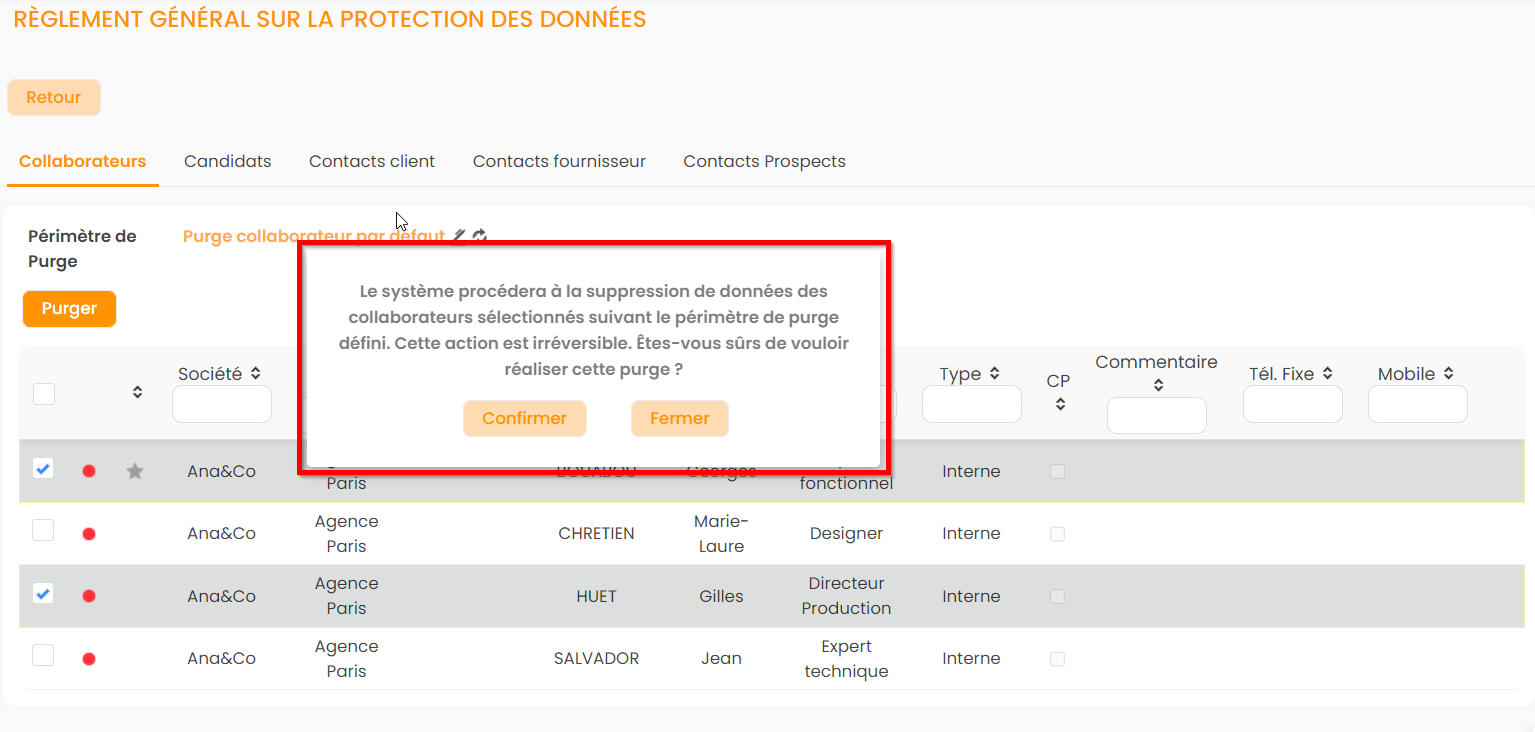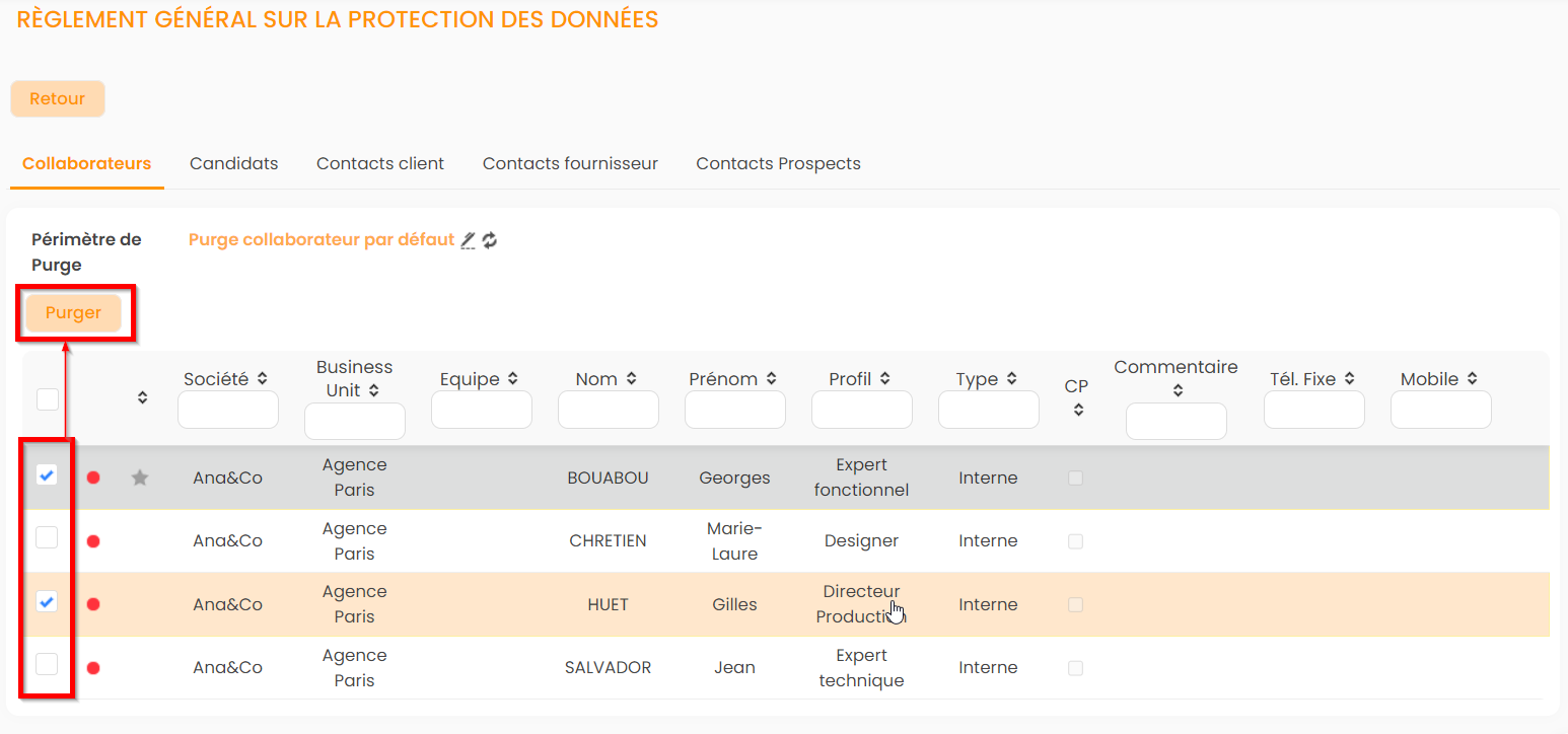 - Cocher la check-box des collaborateurs que vous souhaitez purger. Pour sélectionner tous les collaborateurs, cliquer sur la case en haut à gauche dans l'entête.