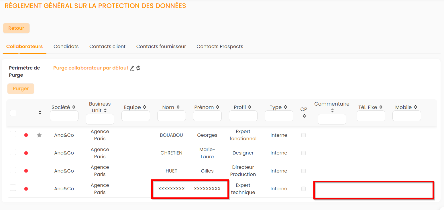 - Après avoir cliqué sur Confirmer, les collaborateurs sont purgés. Les champs sont Gardé, Anonymisé ou Supprimé, selon ce que vous avez défini dans le périmètre de purge (voir article Gérer les périmètres de purge partie 1.)