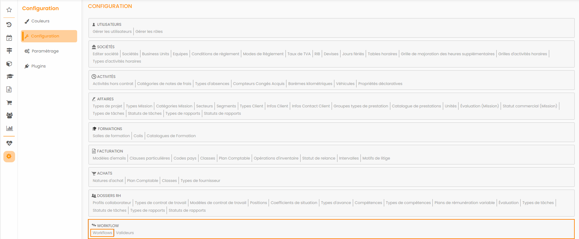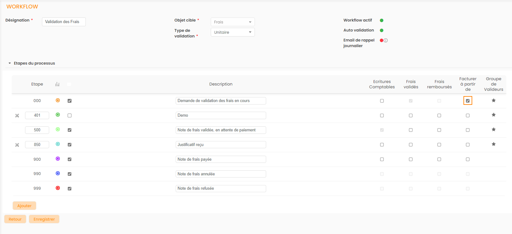 Si ce n'est pas le cas, il vous faut activer manuellement l'étape de validation pour laquelle vous allez inclure ces frais dans les factures. Cette configuration s'accède depuis Paramètres>Workflow>Workflows: