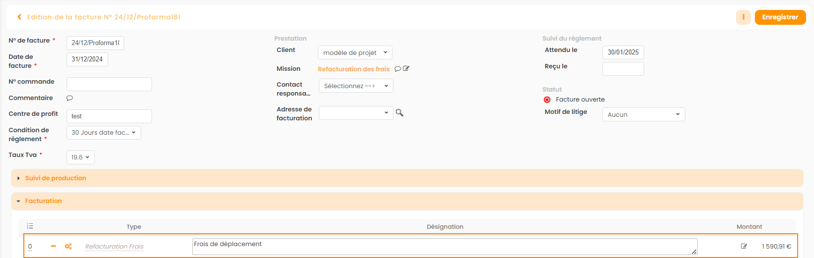 On se rend compte que la ligne de refacturation de frais s'est ajoutée automatiquement, avec un montant non disponible.