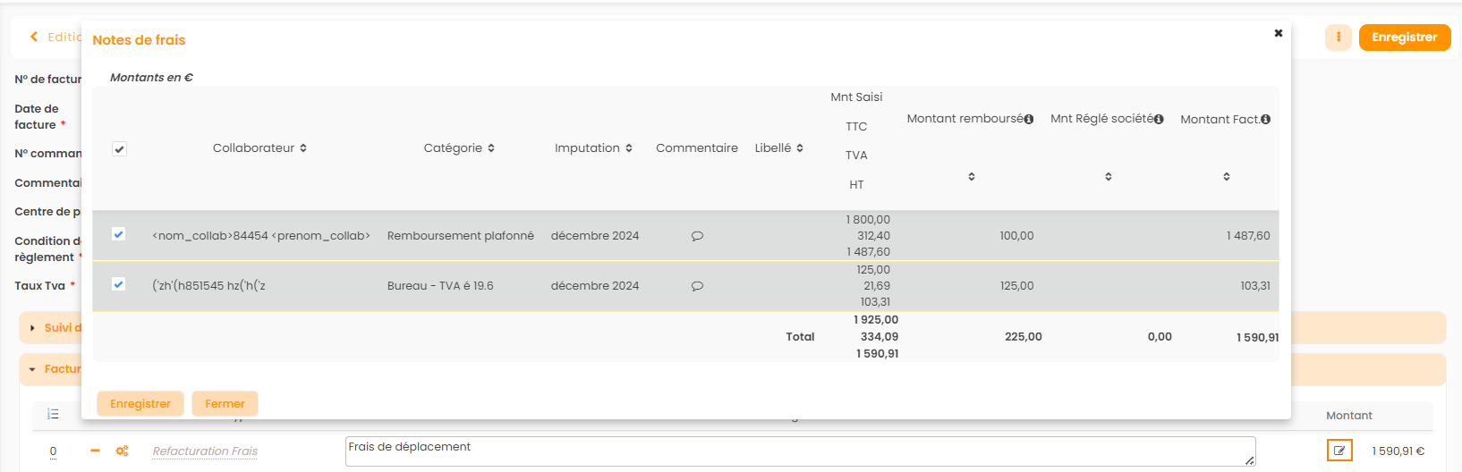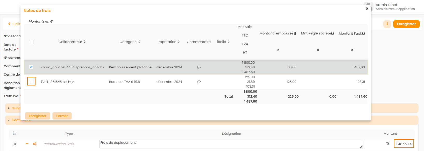 Il est même possible de désactiver certaines notes de frais au moment de la facturation, en décochant la checkbox et en appuyant sur enregistrer.