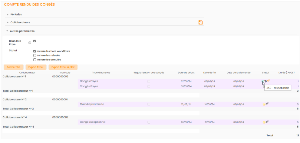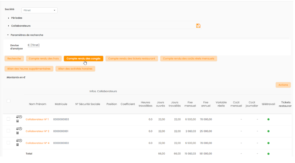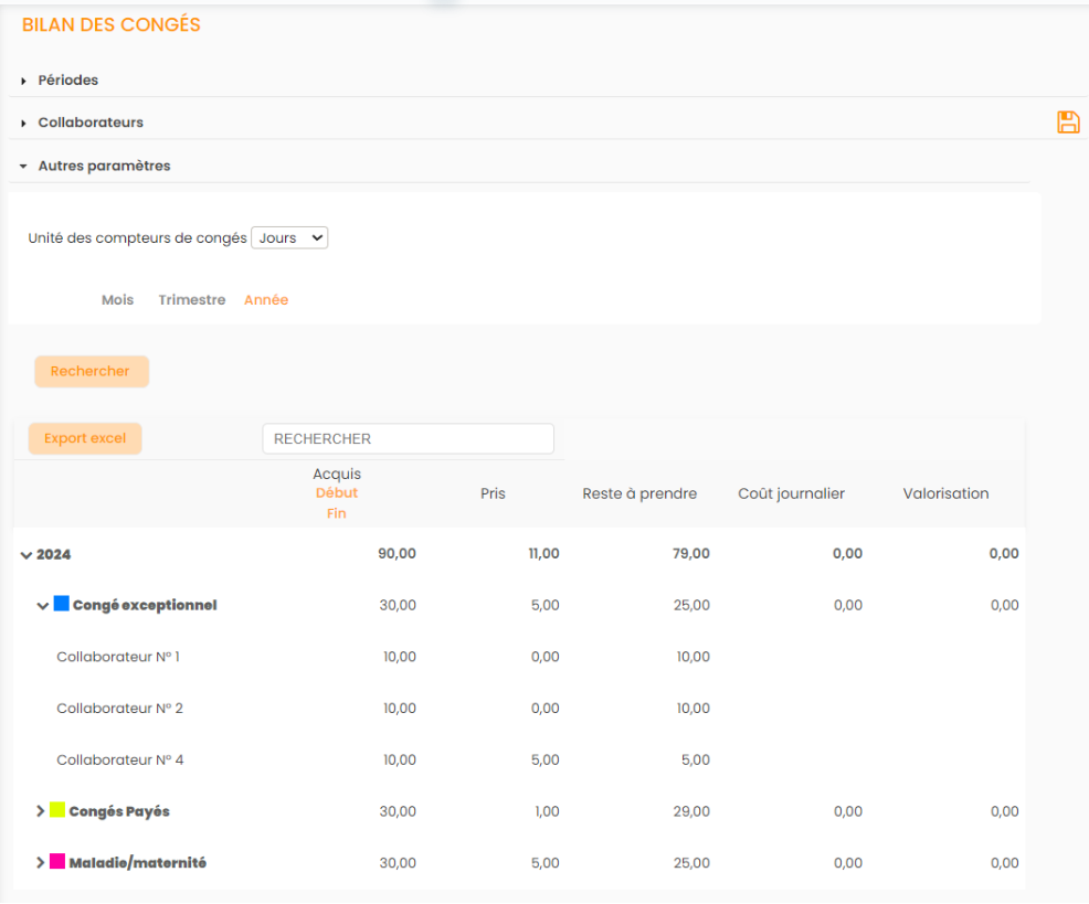 Le Bilan des congés remonte le cumul des congés sur une période sélectionnée, ainsi que la valorisation de ces congés. Pour plus d'information cliquez ici.