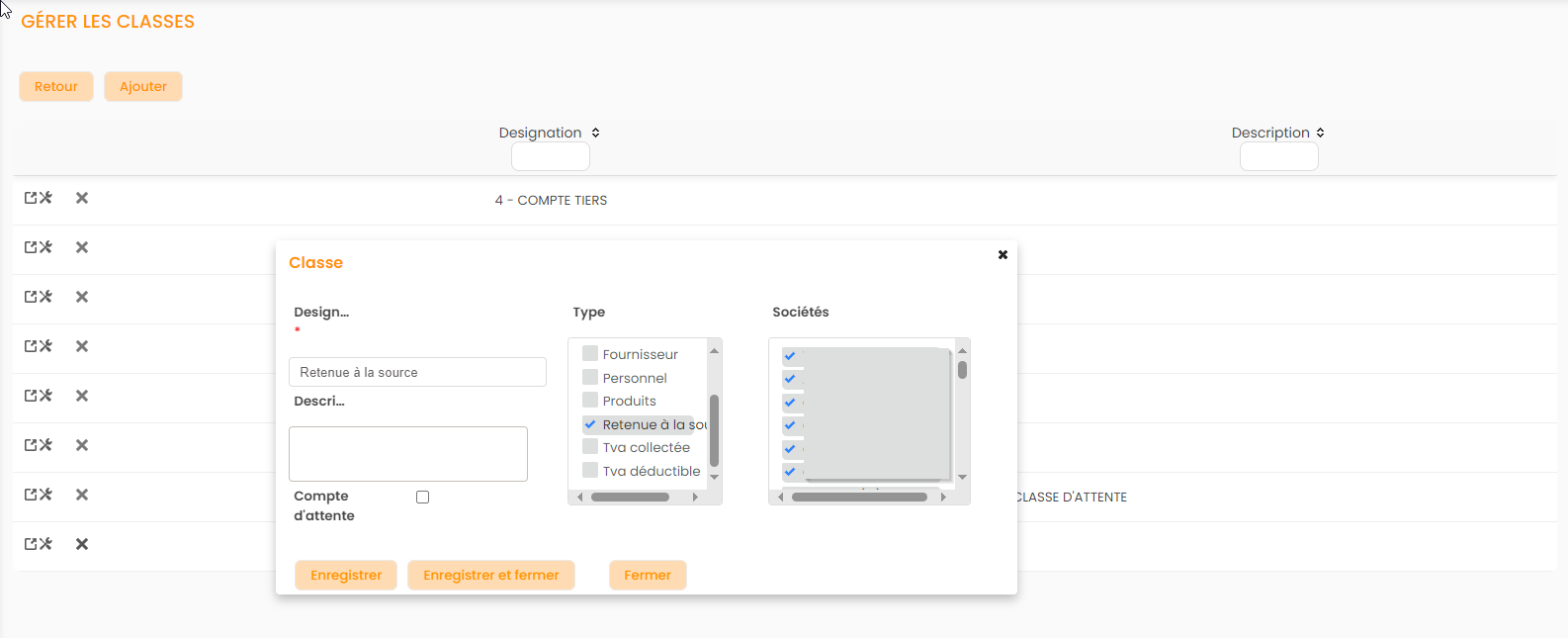 Au niveau de la Configuration -> Facturation ou Achats -> Classes -> , on peut tout d'abord créer une Classe en cochant le Type = Retenue à la source (étape obligatoire uniquement si on renseigne la classe dans la configuration des comptes)