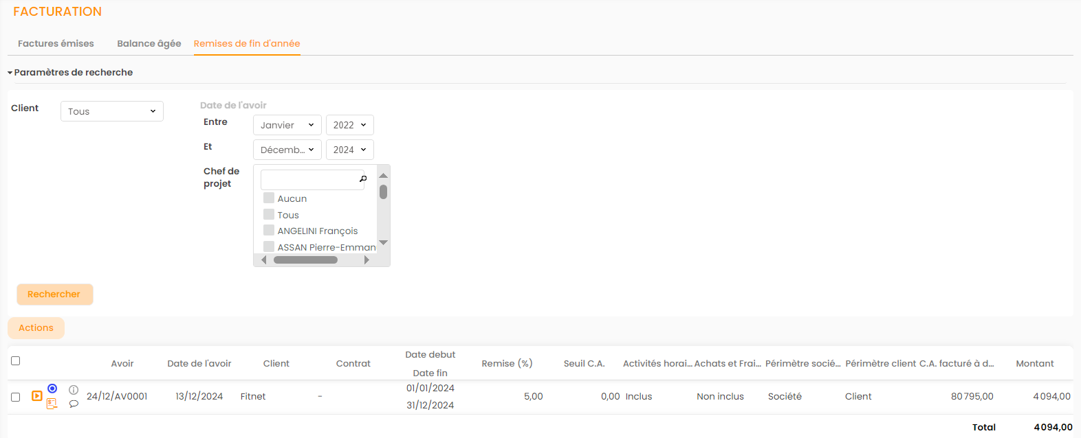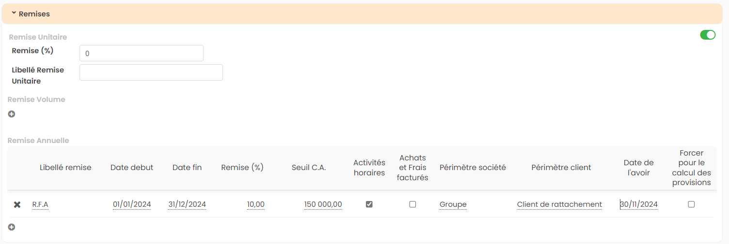 Une fois le paramètre “Suivi des RFA : Remises de fin d’année” (dans Affaires > Fonctionnalités) activé, il est possible de configurer des RFA sur chaque client et/ou sur chaque contrat. La configuration des conditions d’attribution, les périodes d’attribution ainsi que les seuils … sont totalement modulables.