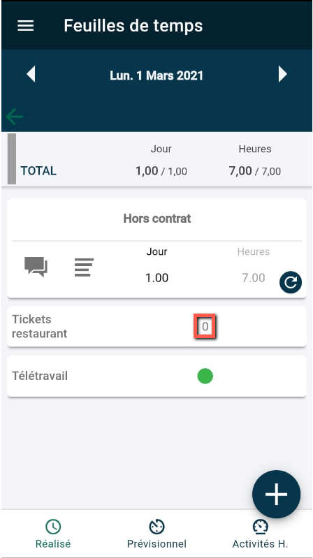 Dans la saisie de votre activité journalière si votre système de gestion des tickets restaurant est paramétrée sur la saisie manuelle une section : Tickets restaurant sera disponible.