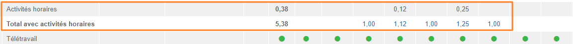 - Feuilles de temps > Activités réalisés (Si le paramètre Afficher les activités horaires actif ET l'activité horaire possède un type "Prise en compte dans le calcul des heures nominales)