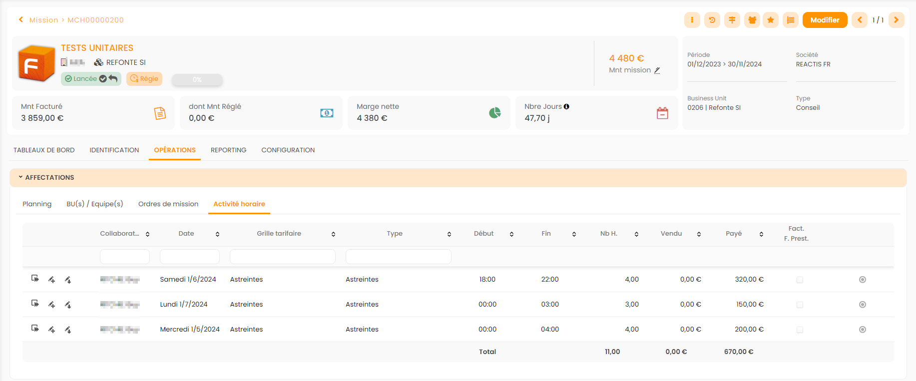 - Feuilles de temps > Activités horaires