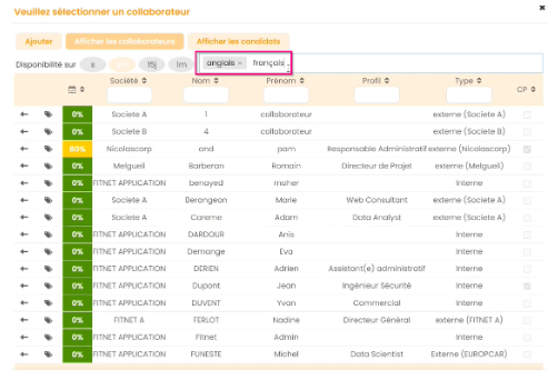 Au moment de l’affectation des collaborateurs, Fitnet Manager permet d’identifier les collaborateurs les plus pertinents par le biais d’une simple recherche par Tags. L’outil effectue une recherche large sur de nombreux termes indexés automatiquement: CVs, compétences, historique des affectations, secteurs/segments clients etc.