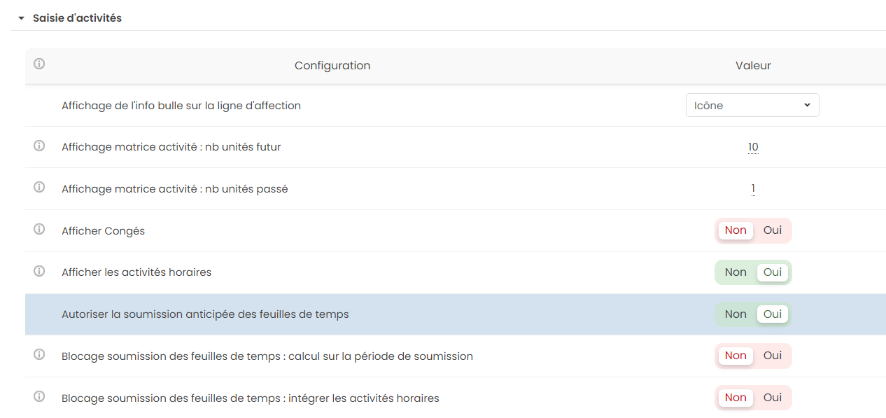 L'activation du paramètre Autoriser la soumission anticipée des feuilles de temps donne la possibilité au collaborateur de saisir son temps réalisé en avance et de soumettre ses feuilles de temps dans le futur.