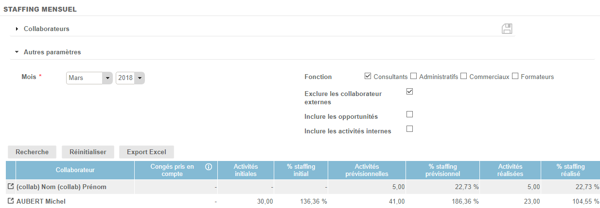 Ce reporting permet d'observer toute les informations relatives au staffing par période d'un mois.