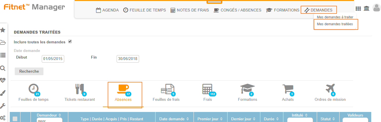 1. Aller dans le menu Activités > Mes demandes > Mes demandes traitées > Absences.