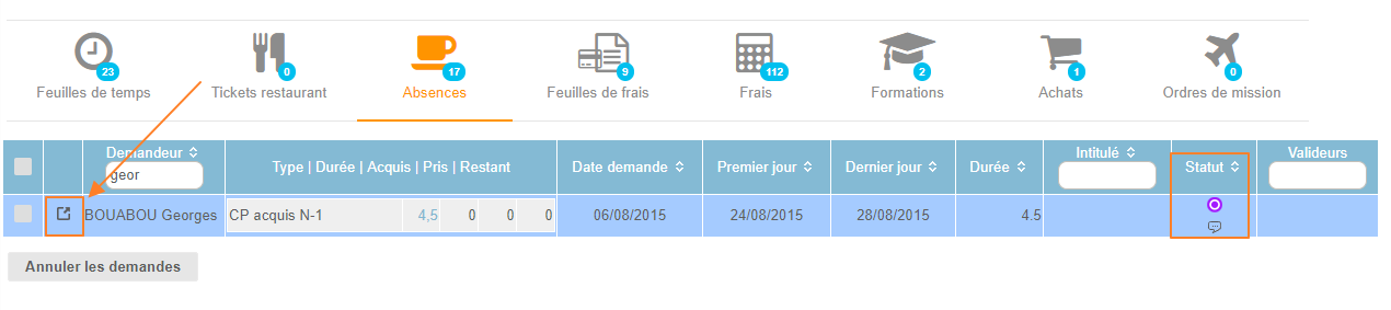 4. Cliquer sur l'icone au début de la ligne pour Afficher la demande